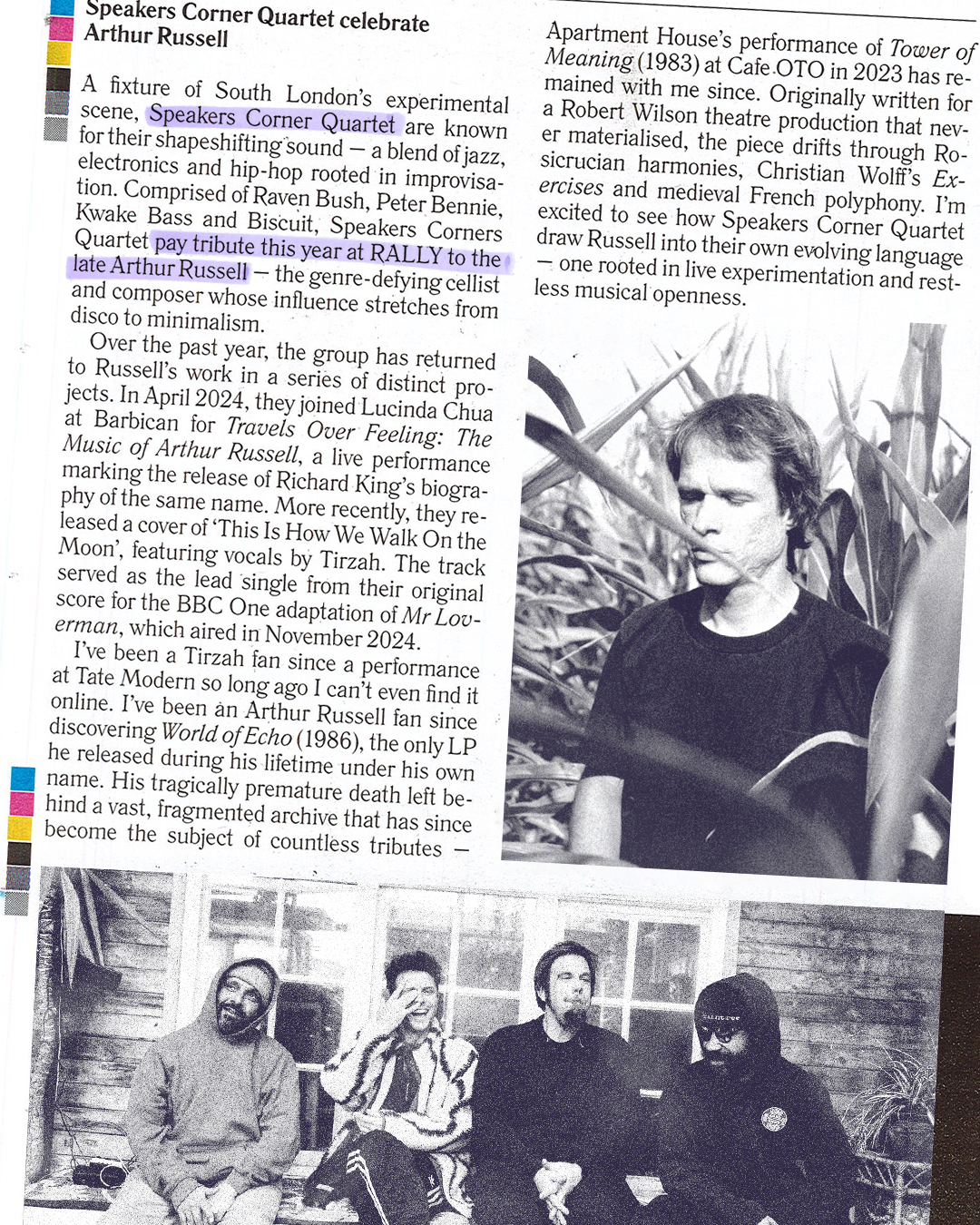 A fixture of South London’s experimental scene, Speakers Corner Quartet are known for their shapeshifting sound – a blend of jazz, electronics and hip-hop rooted in improvisation. Comprised of Raven Bush, Peter Bennie, Kwake Bass and Biscuit, Speakers Corners Quartet pay tribute this year at RALLY to the late Arthur Russell – the genre-defying cellist and composer whose influence stretches from disco to minimalism.