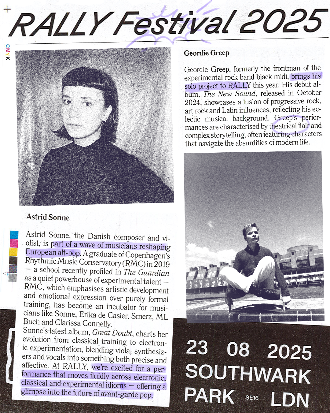 Geordie Greep, formerly the frontman of the experimental rock band black midi, brings his solo project to RALLY this year. His debut album, The New Sound, released in October 2024, showcases a fusion of progressive rock, art rock and Latin influences, reflecting his eclectic musical background. Greep's performances are characterised by theatrical flair and complex storytelling, often featuring characters that navigate the absurdities of modern life.